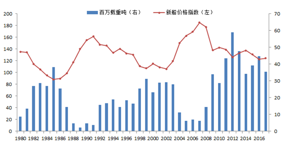 船舶拆解量与新船价格具有明显的负相关性,老旧船舶拆解量越少,新船价格越高。过去三十年,全球老旧船舶拆解有两段时间处于低谷,一是1988-1991四年间,二是2004-2008五年间,这两段时间的新船价格都处于持续上升期,而此后随着老旧船舶拆解量的增长新船价格持续下滑。上一轮拆船高潮持续12年(1992-2003年),年均拆船量2200万DWT,占同期全球船队平均规模的2.8%;本轮拆船高潮已持续9年(2009-2017年),年均拆船量4100万DWT,占同期全球船队平均规模的2.6%。